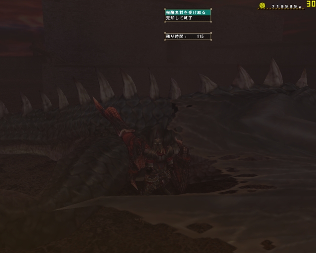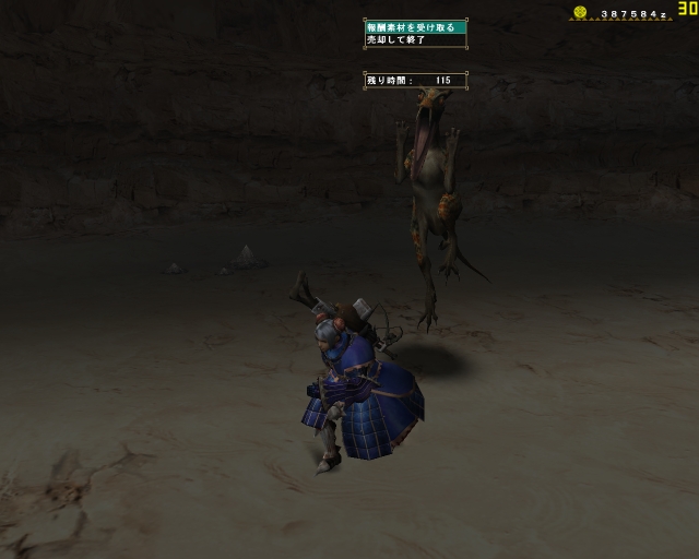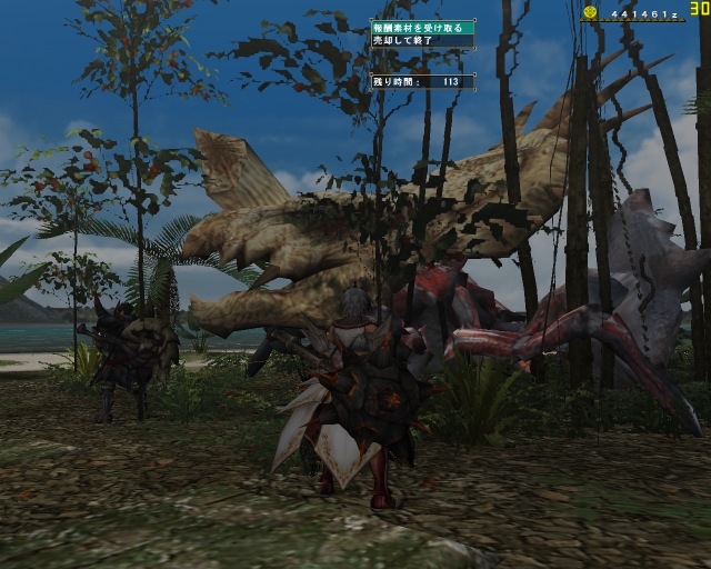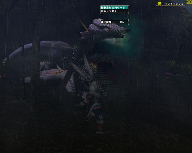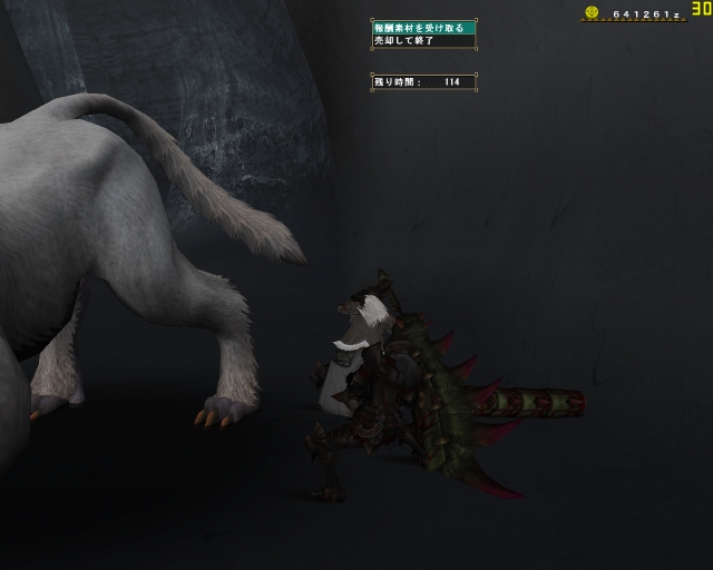 これが終わったら寝ちゃう~言っていたんだけど、やっぱりクエにも行きたい。斬月が宝石券と「牙獣種の毛皮Ⅲ」が要ると言い出して(これは昨日調べた「弩弓怪鳥砲SP」の生産素材だから、きっと同じものを作ろうとしているんだな~w)わたしもそれは必要なので一緒に出かける。