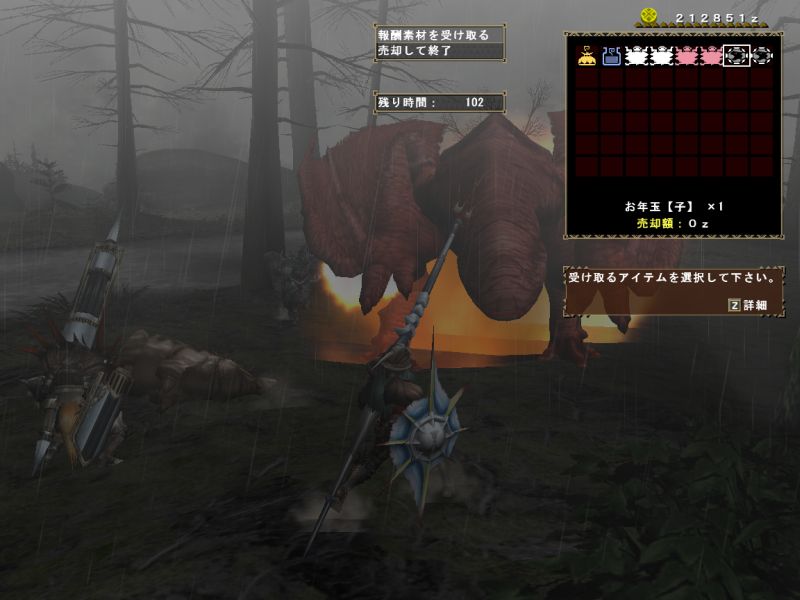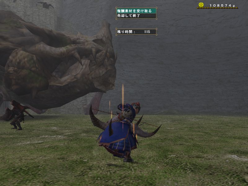 メテオくらって1死、殴られて2死。3死目はわたしかバルカンかどちらかだーと思っていたらやはりそのあたりで龍撃砲をぶっ放したとたんに討伐達成になった、よかった~。