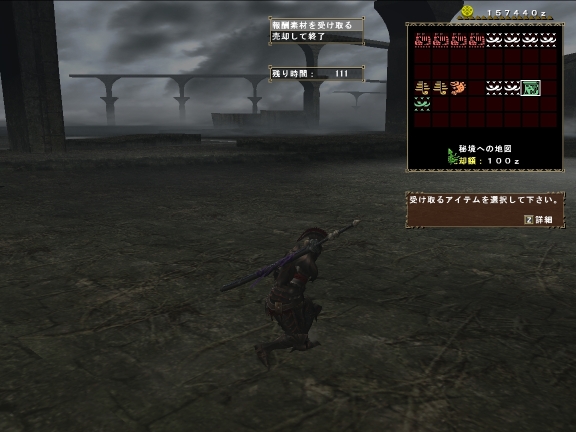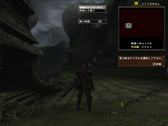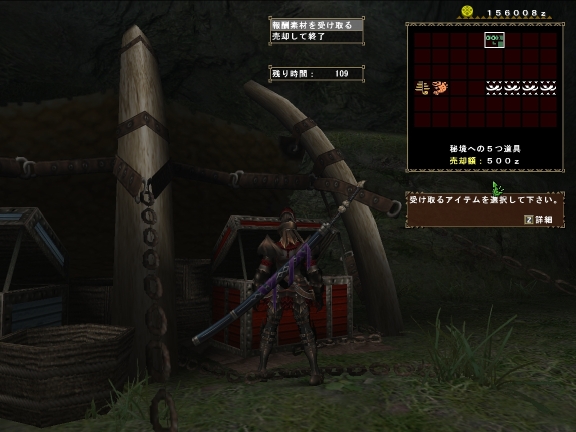例によって待たせちゃいけないとあせって、回復G忘れ、砥石忘れ、この時点で爪護符と肉3こ、ホット2こしか持っていない(しかもホットは要らんだろ?)というひどさ。。。クビになるわけだよね。