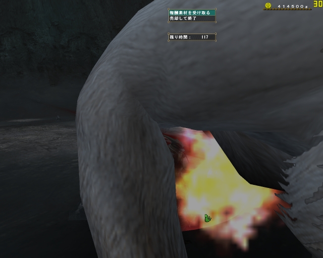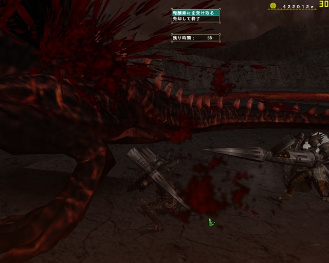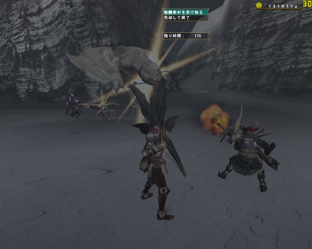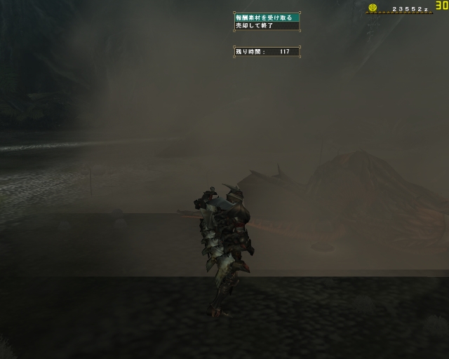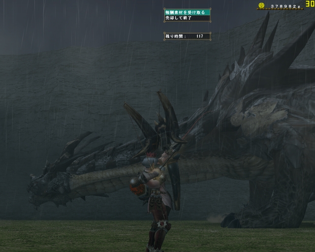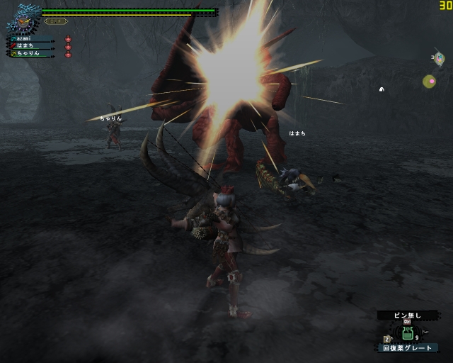 痺れたところを助けに来てくれたはまちさんともどもフルフルのジャンプの下敷きになってなんと同時に死亡でクエストファイルド;; もう脚ひきずってたのになぁ、フルフルの雷の玉はこわいなー。