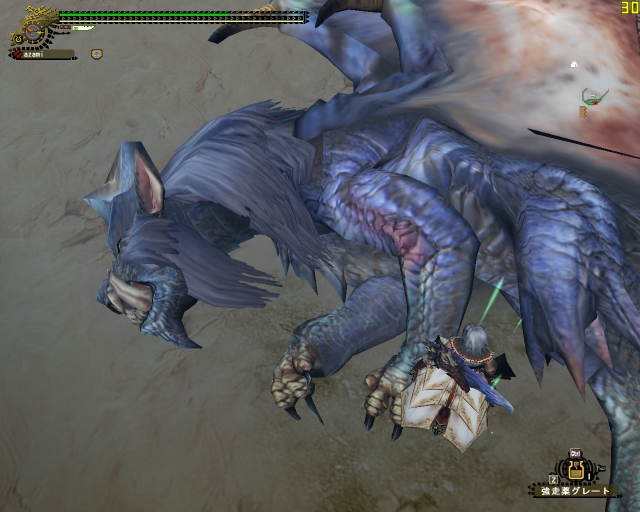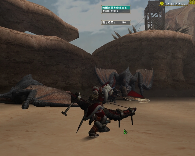 とりあえず「迷ったらディア」だよね、あ、魚竜のコインも欲しいですというわけで「たまご運び」の演習に。ガンナーで行って徹甲留弾を無駄にして見事に失敗w 2人で片方ガンナーだと圧倒的に音爆たんないねー、わたしもハンマーで行く~とドンドルマに戻ったら、入ってきた人が 「はじめまして~」
