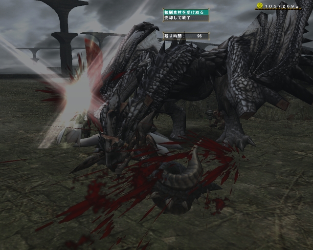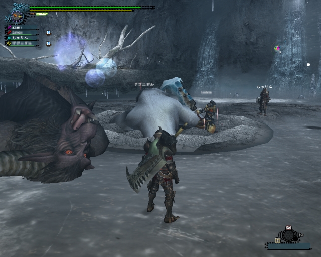 斬月は真正面からハンマーで突進を止め、ちゃりんさんはハンマーで飛びあがるエスピナス叩き落していた。わたしもハンマーで行ってみたがいいところなし。動きが早いので追っかけまわす格好になって殴るどころで無いw あいかわらず角をへしおっても「棘竜の角」は出ないという・・・