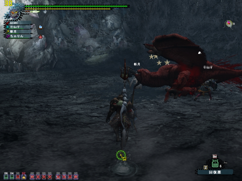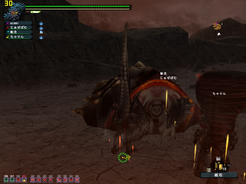 斬月は武器が他のメンバーとかぶらなければハンマーで、ちゃりんさんは火力に不足が無ければネコ片手剣で来て龍を「パリパリ」させる。